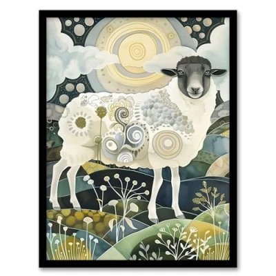 Artery8 Stylised Sheep with Patterns Full Moon Folk Art Living Room Artwork Framed Wall Print A4