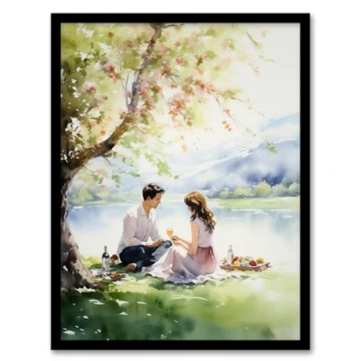 Artery8 Summer Romance Watercolour Painting Picnic By The Lake Under A Cherry Blossom Tree Bedroom Art Artwork Framed Wall Print A4