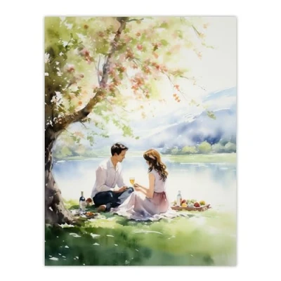 Artery8 Summer Romance Watercolour Painting Picnic By The Lake Under A Cherry Blossom Tree Bedroom Art Extra Large XL Wall Poster Print