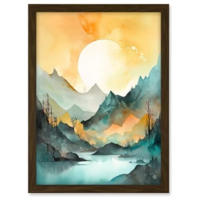 Artery8 Sun Rising Over Mountain Lakeside Landscape Modern Pastel Teal and Orange Watercolour Painting Artwork Framed A3 Wall Art Print