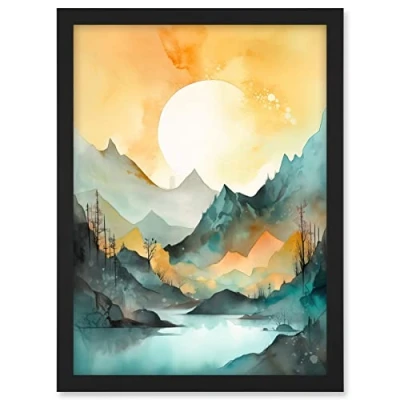 Artery8 Sun Rising Over Mountain Lakeside Landscape Modern Pastel Teal and Orange Watercolour Painting Artwork Framed A3 Wall Art Print