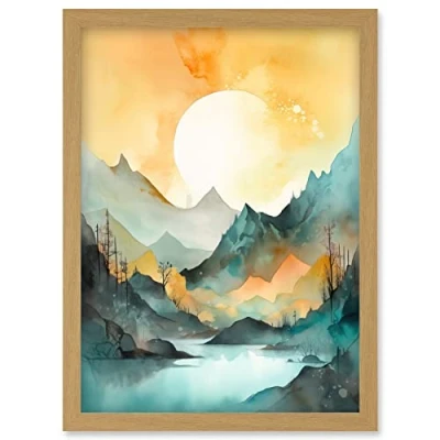 Artery8 Sun Rising Over Mountain Lakeside Landscape Modern Pastel Teal and Orange Watercolour Painting Artwork Framed Wall Art Print A4