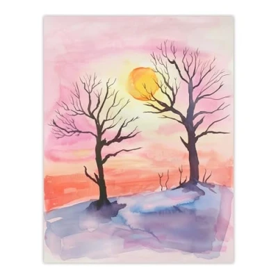 Artery8 Sun Rising Over Two Winter Trees Snow Landscape Living Room Large Wall Art Poster Print Thick Paper 18X24 Inch