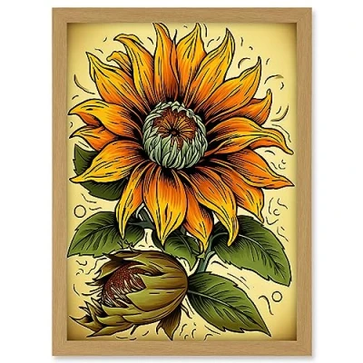 Artery8 Sunflower Bloom Old School USA Tattoo Ink Body Art Rockabilly Americana 50s Artwork Framed A3 Wall Print