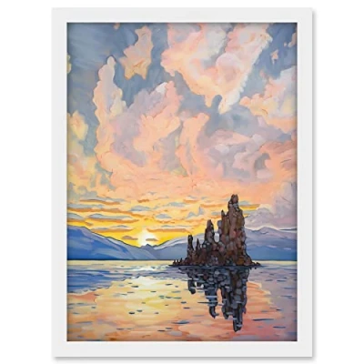 Artery8 Sunrise Atmospheric Clouds Over Mono Lake Mountain Lakeside Landscape Modern Watercolour Painting Artwork Framed A3 Wall Art Print