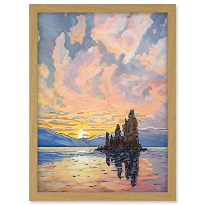 Artery8 Sunrise Atmospheric Clouds Over Mono Lake Mountain Lakeside Landscape Modern Watercolour Painting Artwork Framed A3 Wall Art Print