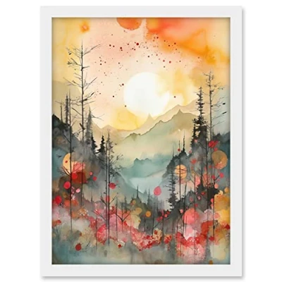 Artery8 Sunrise Over Misty Mountain Forest Landscape Modern Watercolour Painting Artwork Framed A3 Wall Art Print
