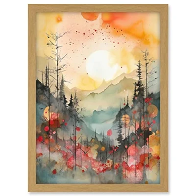 Artery8 Sunrise Over Misty Mountain Forest Landscape Modern Watercolour Painting Artwork Framed A3 Wall Art Print