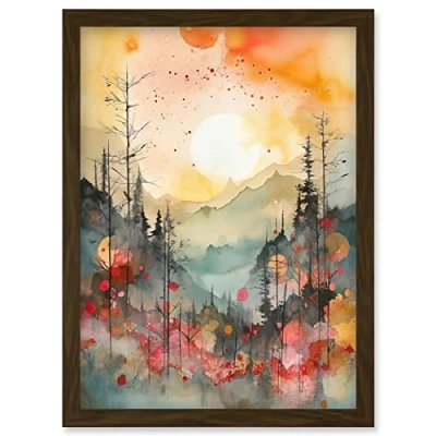Artery8 Sunrise Over Misty Mountain Forest Landscape Modern Watercolour Painting Artwork Framed Wall Art Print A4
