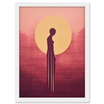 Artery8 Sunrise Solitude Minimalist Artwork Plum Pink Gold African Woman Silhouette in Golden Sun Halo Framed A3 Wall Art Print