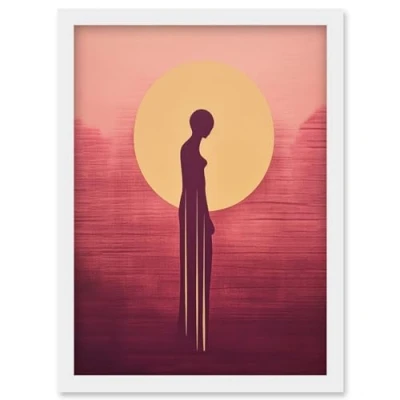 Artery8 Sunrise Solitude Minimalist Artwork Plum Pink Gold African Woman Silhouette in Golden Sun Halo Framed Wall Art Print A4