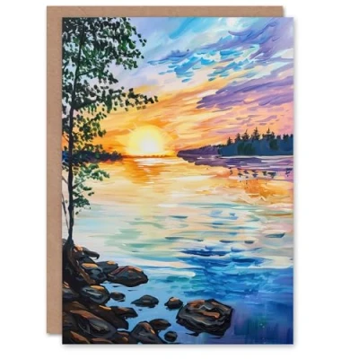 Artery8 Sunset on Calm Lake Oil Painting Tranquil Peace Greeting Birthday Card Him Her All Blank