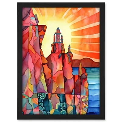 Artery8 Sunset Over Temple On Cliffs Folk Art Artwork Framed A3 Wall Print