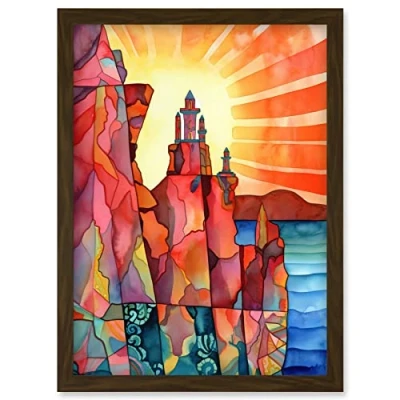 Artery8 Sunset Over Temple On Cliffs Folk Art Artwork Framed Wall Print A4