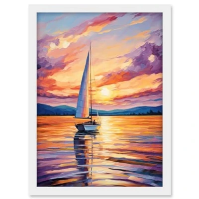 Artery8 Sunset Sailing Vibrant Oil Painting Orange Purple Blue Bathroom Artwork Sail Boat Seascape Framed A3 Wall Art Print