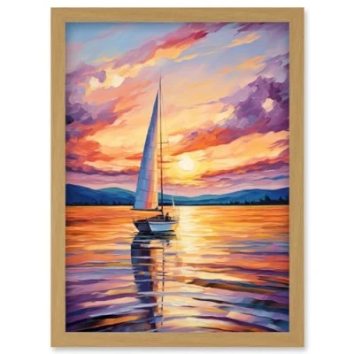 Artery8 Sunset Sailing Vibrant Oil Painting Orange Purple Blue Bathroom Artwork Sail Boat Seascape Framed Wall Art Print A4