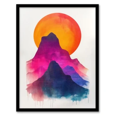 Artery8 Sunset Sun Behind Colourful Mountains Painting For Living Room Artwork Framed Wall Art Print A4