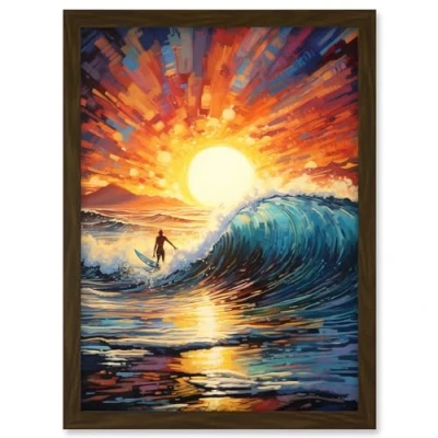 Artery8 Sunset Surf Waves Surfing Artwork Vibrant Blue Purple Orange Setting Sun Behind Surfer in Wavy Seascape Framed A3 Wall Art Print