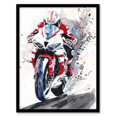 Artery8 Superbike Motorcycle Rider Race Sport Watercolour Man Cave Artwork Framed Wall Art Print A4