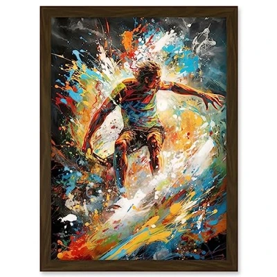 Artery8 Surfer Surfing on Crashing Waves Splatter Paint Artwork Framed A3 Wall Art Print