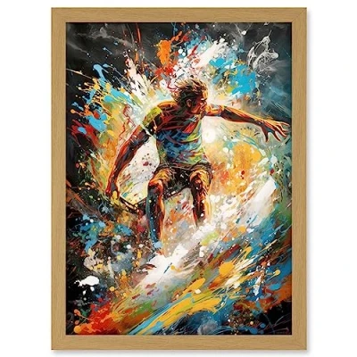 Artery8 Surfer Surfing on Crashing Waves Splatter Paint Artwork Framed A3 Wall Art Print