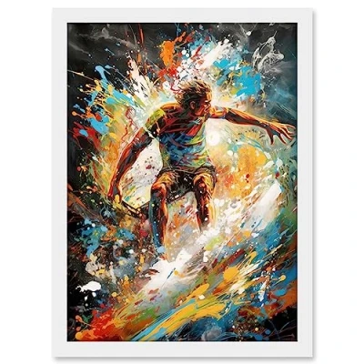Artery8 Surfer Surfing on Crashing Waves Splatter Paint Artwork Framed A3 Wall Art Print