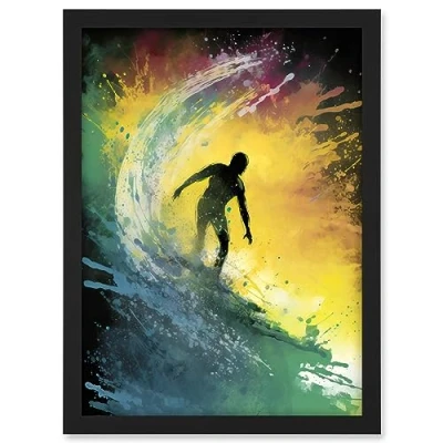 Artery8 Surfer Surfing Riding a Big Rainbow Colour Wave Artwork Framed A3 Wall Art Print