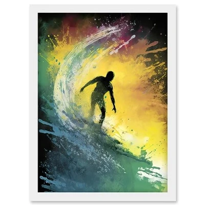 Artery8 Surfer Surfing Riding a Big Rainbow Colour Wave Artwork Framed Wall Art Print A4