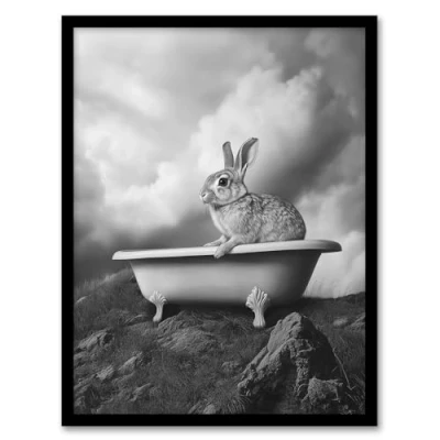 Artery8 Surreal Bunny Rabbit Hare in Bathtub Black White Bathroom Toilet Artwork Framed Wall Art Print A4