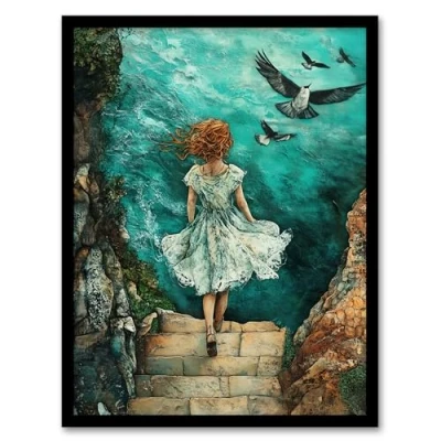 Artery8 Surreal Dream Dive Girl Stone Steps Sea Birds Bathroom Toilet Artwork Framed Wall Art Print 18X24 Inch
