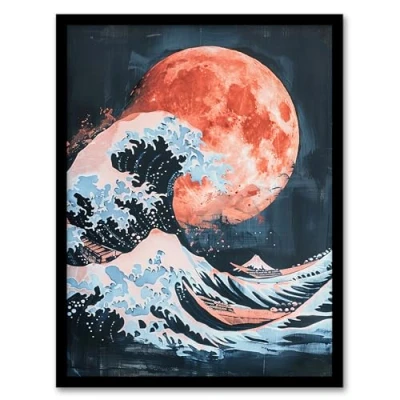 Artery8 Surreal Great Wave Blood Moon Sea Storm Painting Living Room Artwork Framed Wall Art Print A4