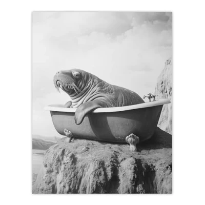 Artery8 Surreal Walrus in Bathtub Black White Coastal Bathroom Toilet Extra Large XL Wall Art Poster Print