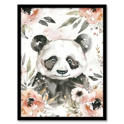 Artery8 Sweet Panda Watercolour Portrait Wildflowers Cute Living Room Artwork Framed Wall Art Print A4