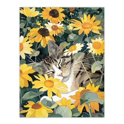 Artery8 Tabby Cat Lover Asleep in Wildflower Garden Living Room Large Wall Art Poster Print Thick Paper 18X24 Inch