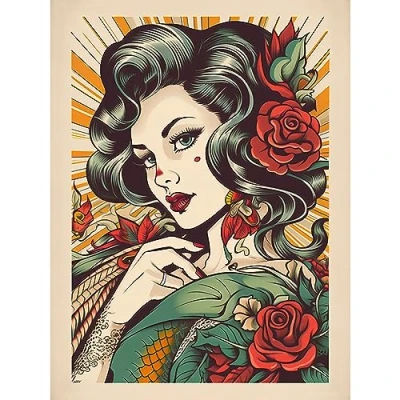 Artery8 Tattoo Pin Up Girl Roses Rockabilly Americana 50s Large Wall Art Poster Print Thick Paper 18X24 Inch