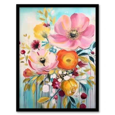 Artery8 Teal Pink Yellow Flowers Bright Elegant Oil Painting Vibrant Spring Blooms Artwork Framed Wall Art Print A4