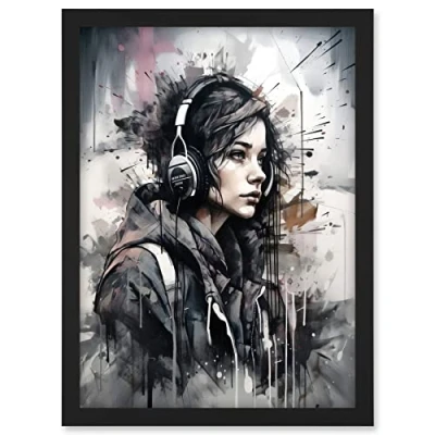 Artery8 Teenager Girl in Black Hoodie Listening to Music through Headphones Modern Watercolour Painting Artwork Framed A3 Wall Art Print