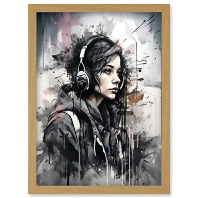 Artery8 Teenager Girl in Black Hoodie Listening to Music through Headphones Modern Watercolour Painting Artwork Framed Wall Art Print A4