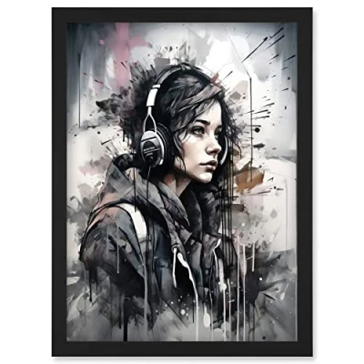 Artery8 Teenager Girl in Black Hoodie Listening to Music through Headphones Modern Watercolour Painting Artwork Framed Wall Art Print A4