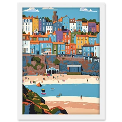 Artery8 Tenby Castle Beach in Wales Colourful Townscape Artwork Framed A3 Wall Art Print