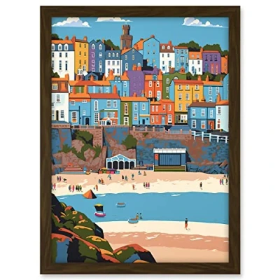 Artery8 Tenby Castle Beach in Wales Colourful Townscape Artwork Framed A3 Wall Art Print