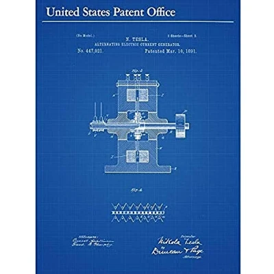 Artery8 Tesla Alternating Electric Current Generator Side 1891 Patent Art Print Canvas Premium Wall Decor Poster Mural