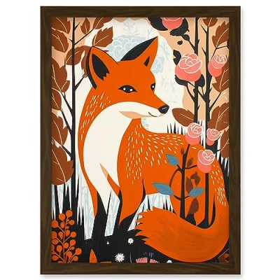 Artery8 The Fox and Rose Bush Pastel Colour Autumn Forest Landscape Flowers Artwork Framed Wall Art Print A4