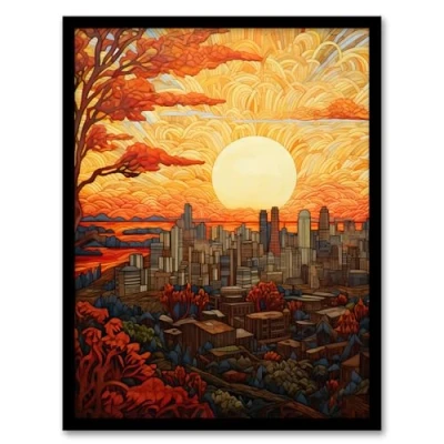 Artery8 The Golden Sunbeam Cityscape Sunset Abstract Artwork Framed Wall Art Print A4