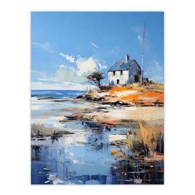 Artery8 The Old White Crofters Cottage Oil Painting Palette Knife Blue Orange Serene Scottish Coastal Landscape Large Wall Art Poster Print Thick Paper 18X24 Inch