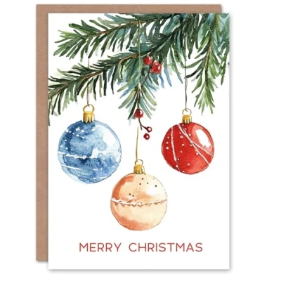 Artery8 Three Baubles Hanging From Tree Watercolour Blank For Him Or Her Art Christmas Card
