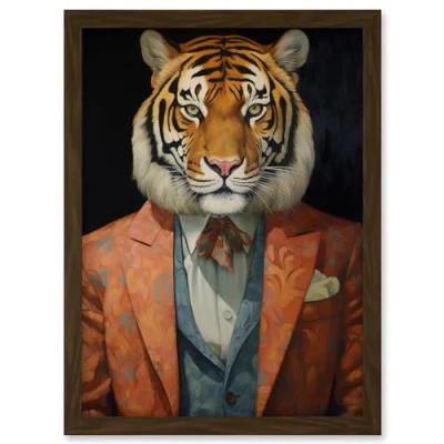 Artery8 Tiger About Town Artwork Coral Pink and Cerulean Blue Suit Conceptual Portrait Framed A3 Wall Art Print