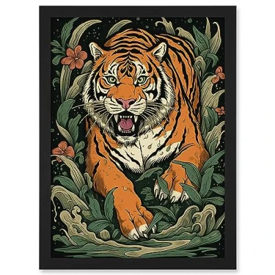 Artery8 Tiger Emerging from Plants Tattoo Ink Body Art Rockabilly Americana 50s Artwork Framed A3 Wall Print