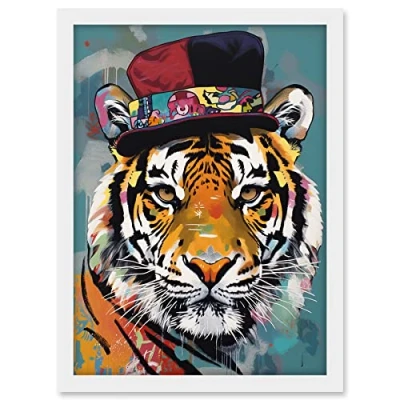 Artery8 Tiger Wearing Soft Felt Top Hat Modern Folk Art Artwork Framed A3 Wall Print
