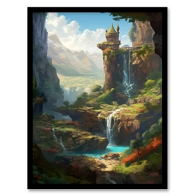 Artery8 Tower over a Cascading Waterfall Conceptual Art Painting Enchanted Forest Mountain Landscape Artwork Framed Wall Print A4
